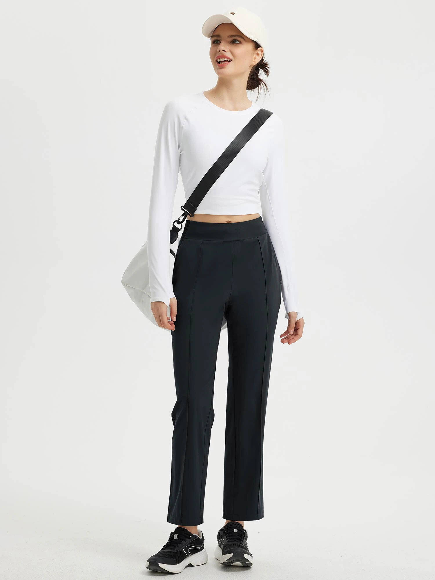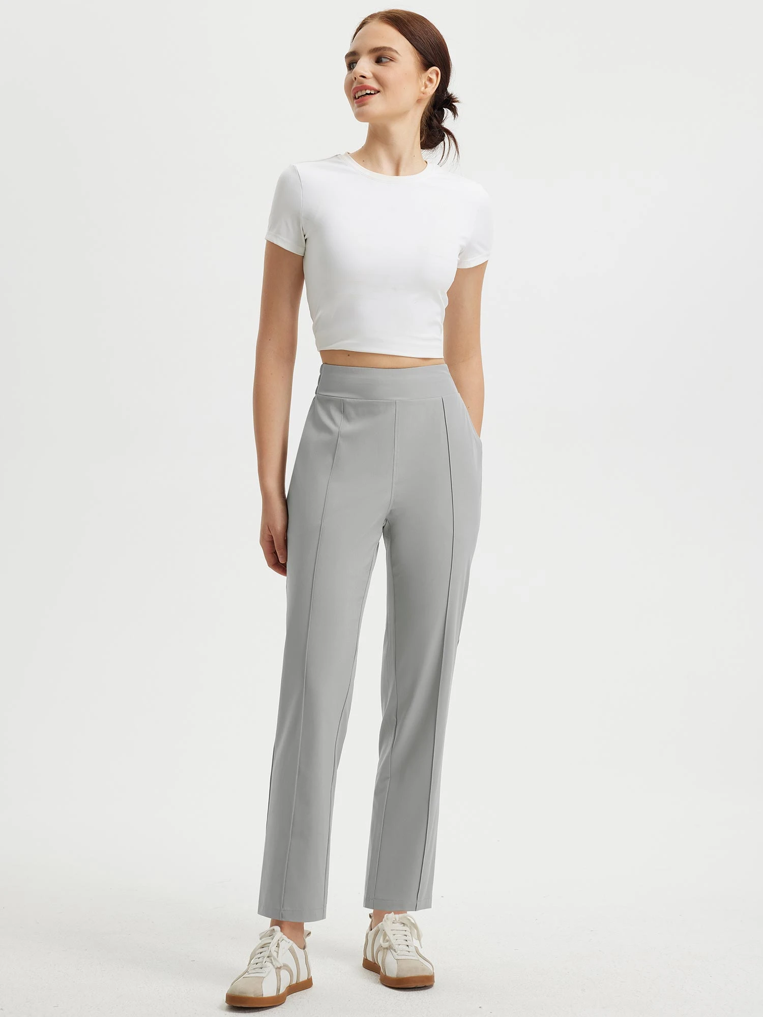 - Flattering Fit: Slim, ankle-length design with a center seam elongates the legs. The flat front and elastic-waisted back offer a secure and comfortable fit that adapts to your body.