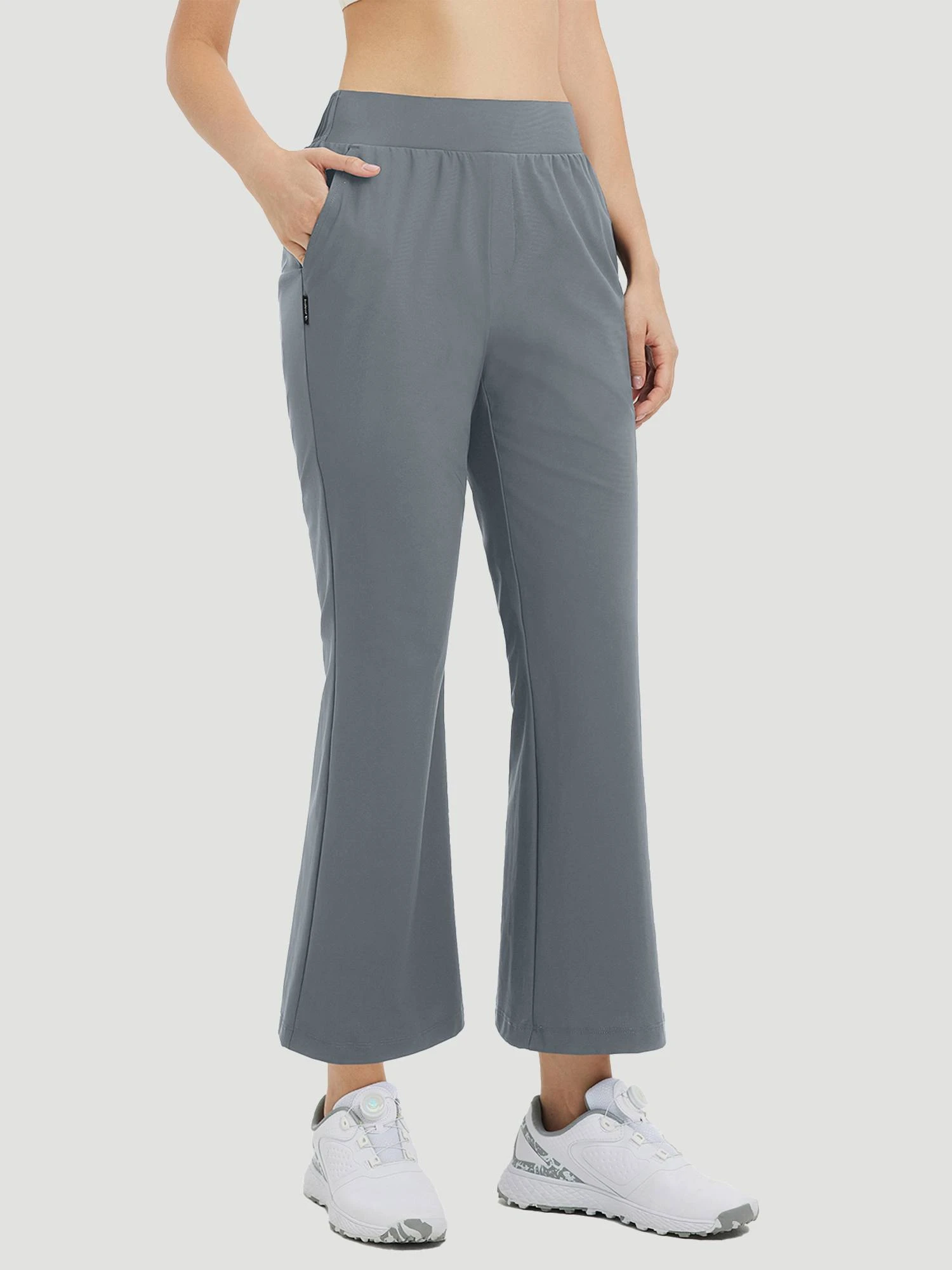 - Slim-fit flared design with 26″ inseam for elegant leg elongation
