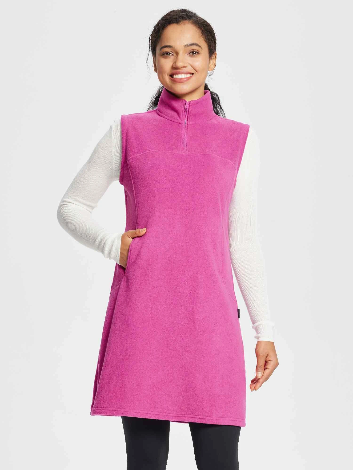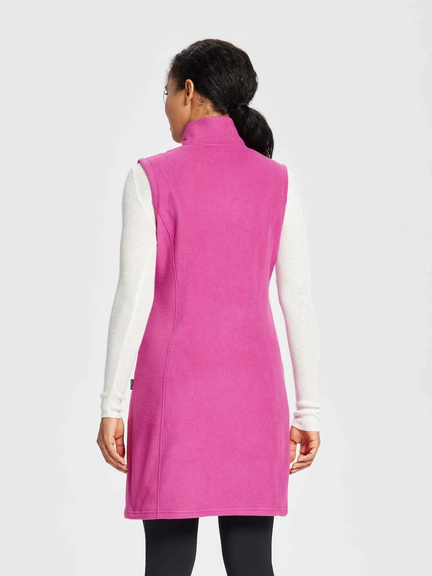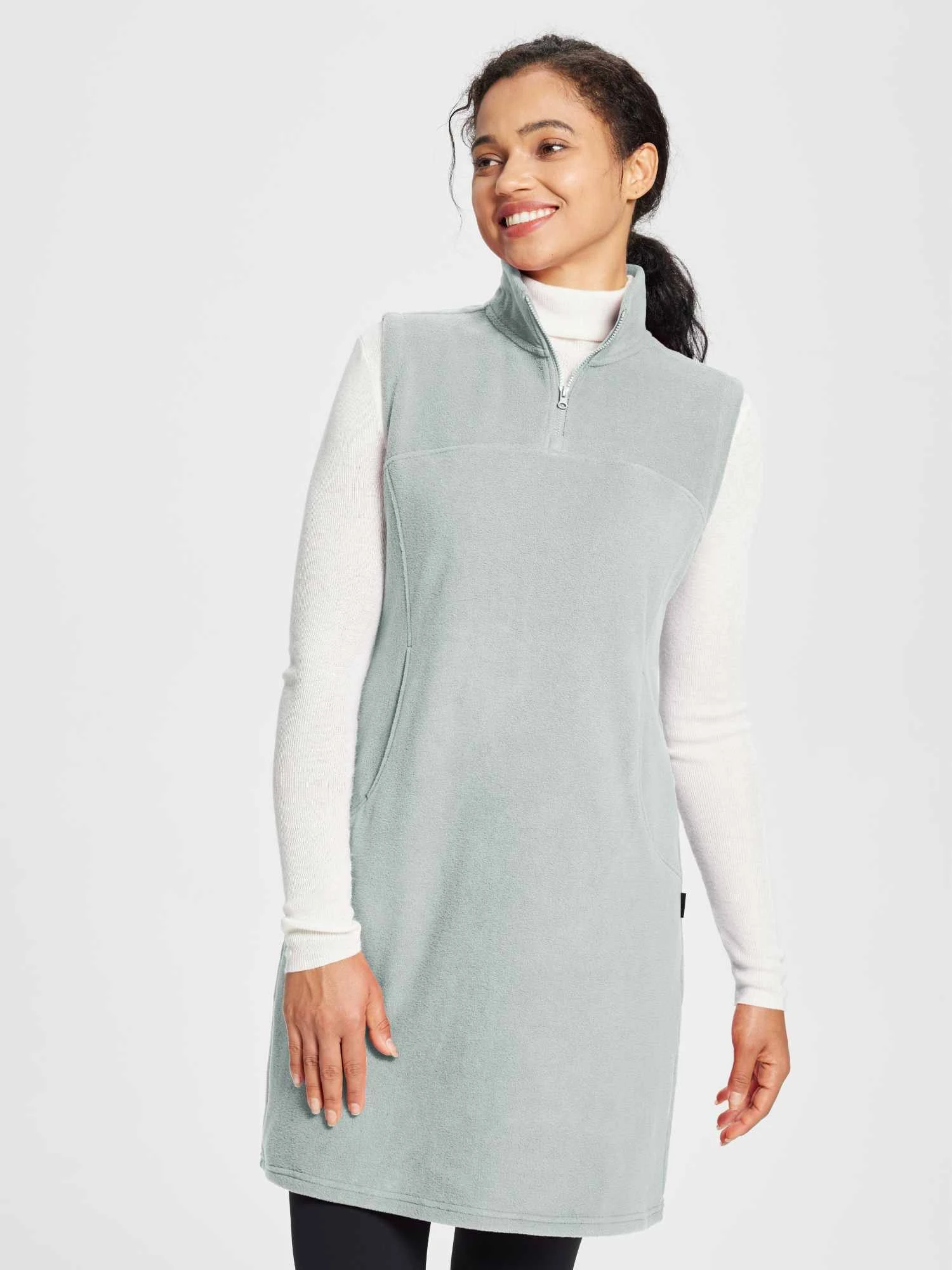 - Approx 34 Inch(Size S)long fleece vest dress above knee length can keep your thigh and hip warm in cold weather. Perfect to wear with legging or jeans when you are lounging, hiking, skiing, or any outdoor activities.