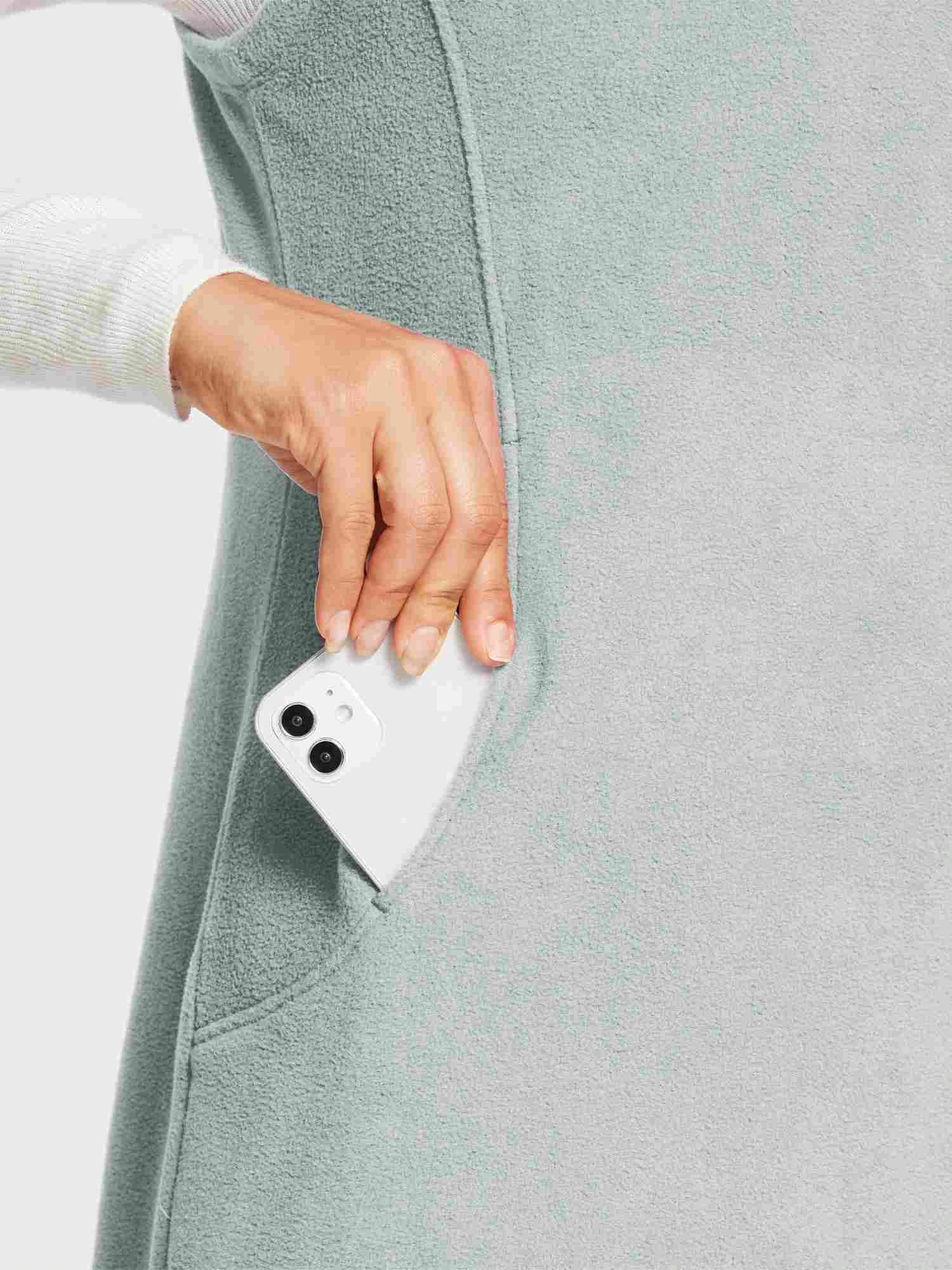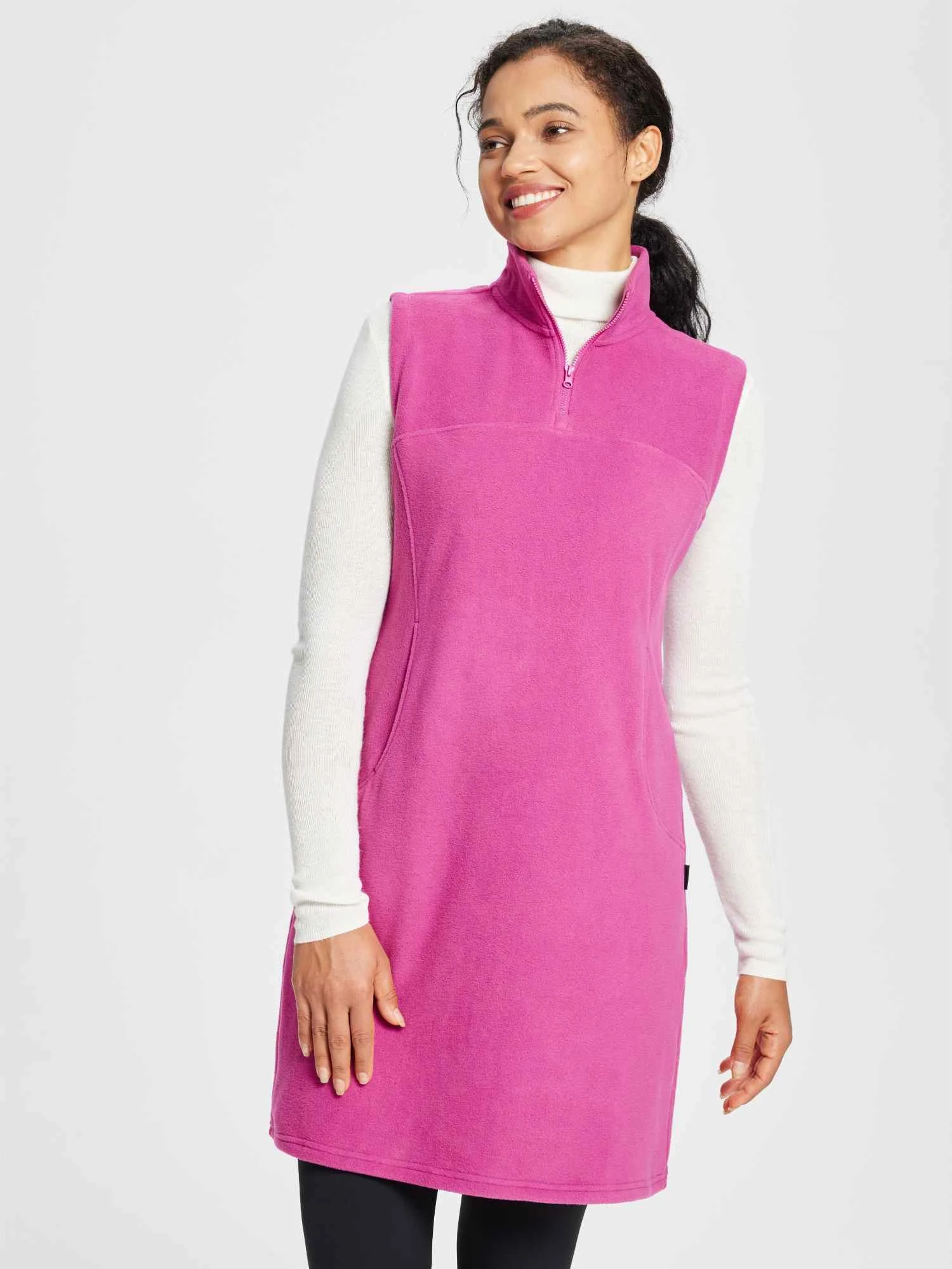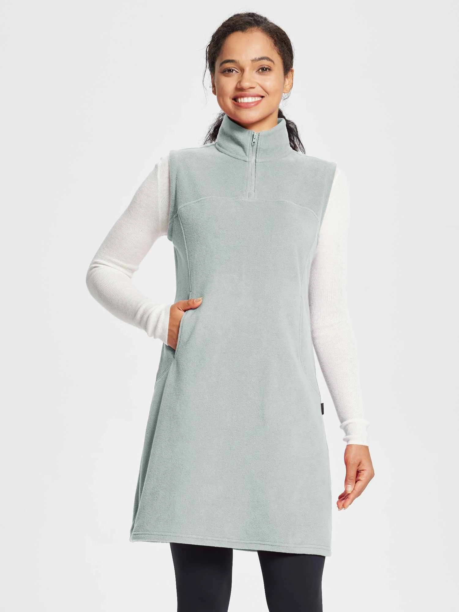 - Approx 34 Inch(Size S)long fleece vest dress above knee length can keep your thigh and hip warm in cold weather. Perfect to wear with legging or jeans when you are lounging, hiking, skiing, or any outdoor activities.