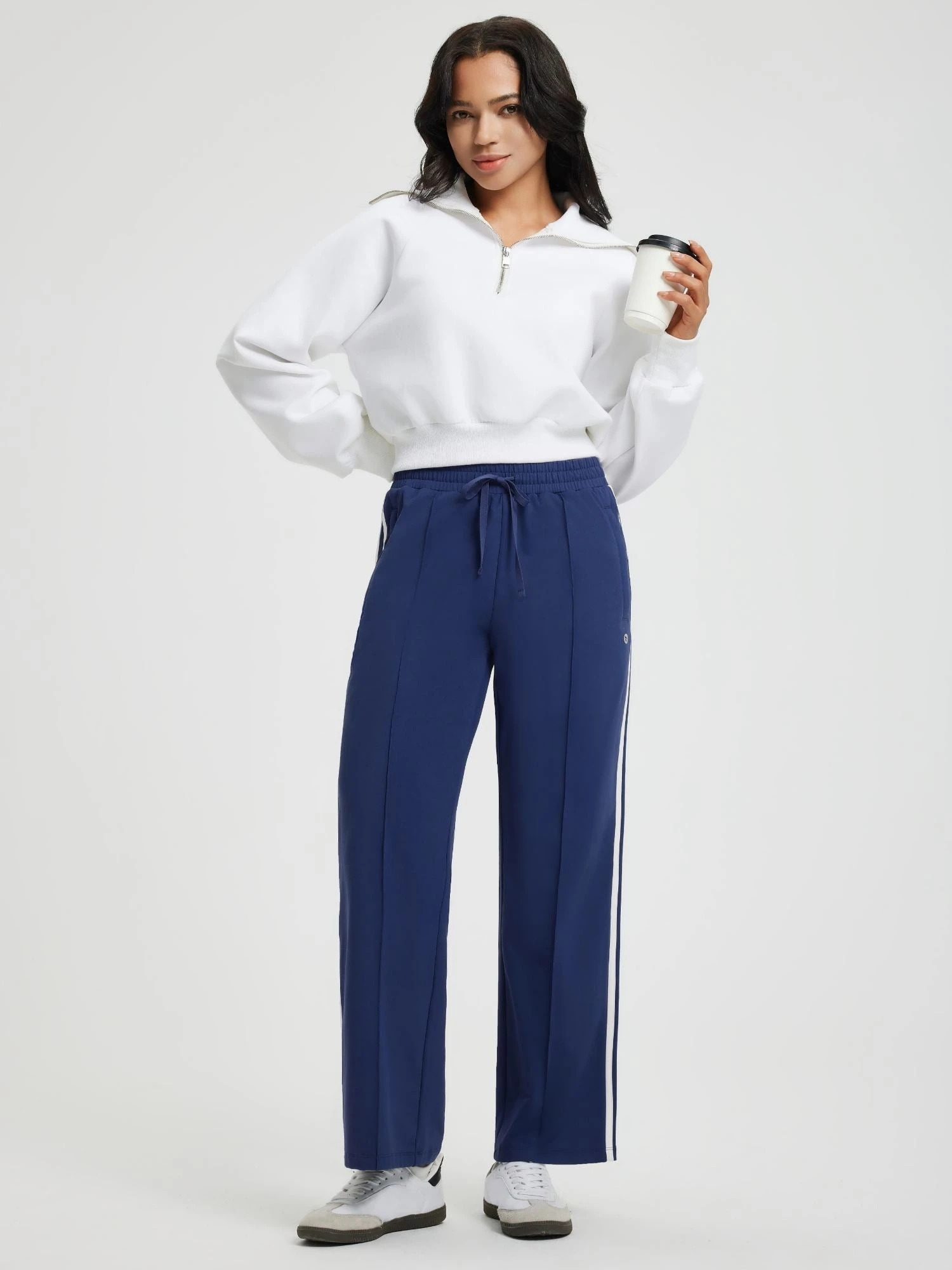 - Straight wide-leg cut with mid-seam detailing elongates legs and creates a crisp silhouette